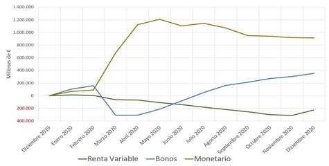 El rally de la Renta Variable lo hemos visto desde Abril hasta hoy en día, pero como vemos en el gráfico, los inversores se lanzaron a invertir en Renta Variable a raíz de la noticia de la vacuna a finales de Noviembre. En Diciembre vemos una entrada de 85.000 M de € hacia la Renta Variable.
