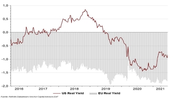 Por el lado del primer factor, el panorama parece más favorable al dólar. El crecimiento económico se proyecta fuerte para EE.UU debido a una reactivación bastante dinámica - EE.UU retornará a niveles de PIB pre-pandemia antes que Europa. Sumado a esto, los tipos de interés en subida favorecerían un carry positivo del dólar, en un campo en donde el euro a priori seguirá con tipos negativos por varios años. Si bien el déficit comercial y fiscal americano sí que son bastante mayores (fuente de fragilidad para el dólar), si analizamos las series históricas siempre lo han sido, por lo que tampoco indicarían una alta injerencia en el tipo de cambio.