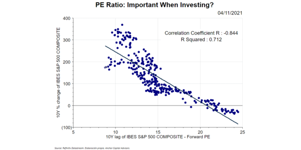- El múltiplo determina el beneficio: matemáticamente, la fórmula del PE Ratio incluye el precio del índice, que a su vez nos determina el retorno a diez años. Por lo tanto, hacer una regresión entre las dos variables puede ser tramposo.