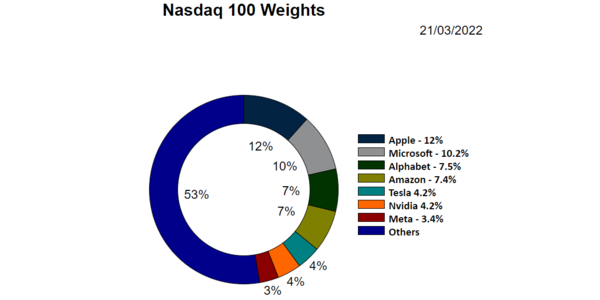 En el gráfico podemos ver como las 7 primeras posiciones del índice Nasdaq 100 significan el 47% de la cartera. Como resultado, tendremos una cartera un tanto binaria, donde el 50% de la cartera no está muy diversificada, pero el otro 50%, sí.