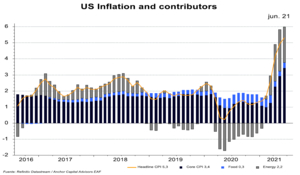 La inflación ha estado preocupando a los inversores en lo que va del año. Los últimos datos arrojados por el IPC americano han mostrado cifras interanuales de 5.4% en junio, 5% en mayo y 4,2% en abril. Vemos que, así como durante 2020 el sector energético fue el principal 'lastre' para el indicador, en 2021 es el primer responsable de la tendencia ascendente en el indice de precios.