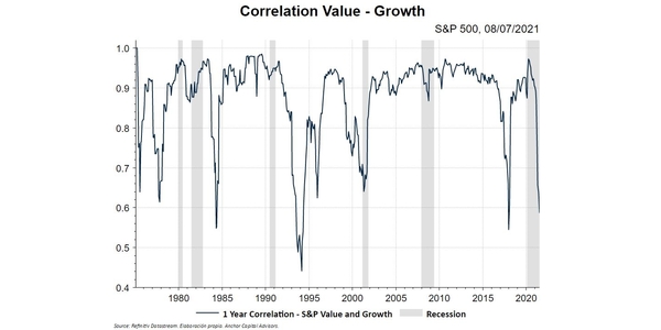 Parece que últimamente el mercado está diferenciando más estos dos estilos de inversión, los cuales se correlacionan menos que en otros periodos: